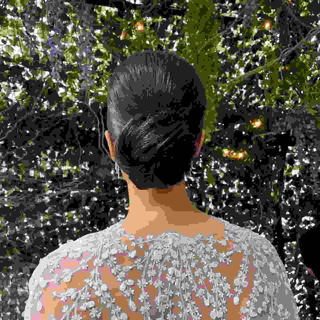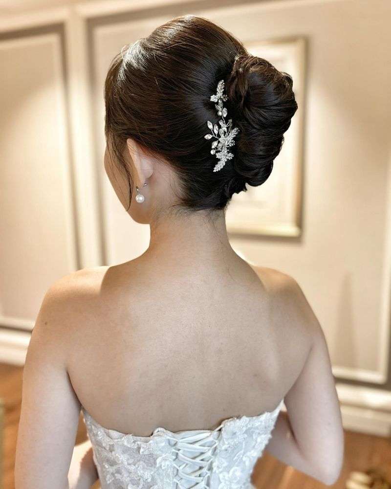 The classic chignon is a timeless bride hairstyle that exudes elegance and grace. This sophisticated low bun is neatly tucked at the nape of the neck, making it perfect for both traditional and modern weddings. Whether paired with a sleek middle part or soft face-framing tendrils, the chignon complements veils, tiaras, or pearl accessories beautifully, ensuring a refined and polished bridal look.