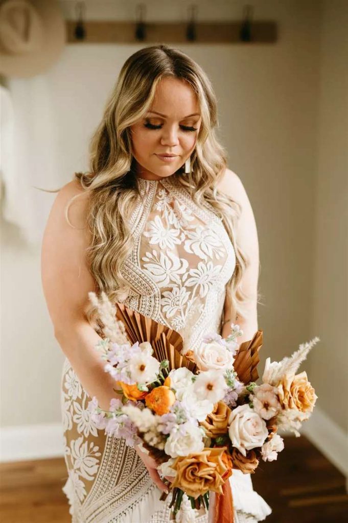 A half-up style combines the best of both worlds by keeping hair away from the face while allowing soft waves to flow freely. This bride hairstyles is versatile and works well with all hair types, making it a popular choice for both classic and boho brides.