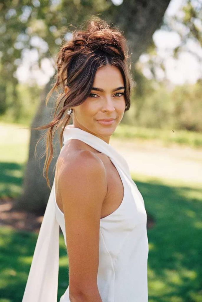 A perfect choice for brides who love effortless elegance, the bridal beachy bun combines soft waves with a relaxed updo. This hairstyle is ideal for beach weddings or outdoor ceremonies, as it holds up beautifully against wind and humidity. With its romantic and carefree vibe, this bride hairstyle pairs well with floral hair accessories or delicate pearl pins.