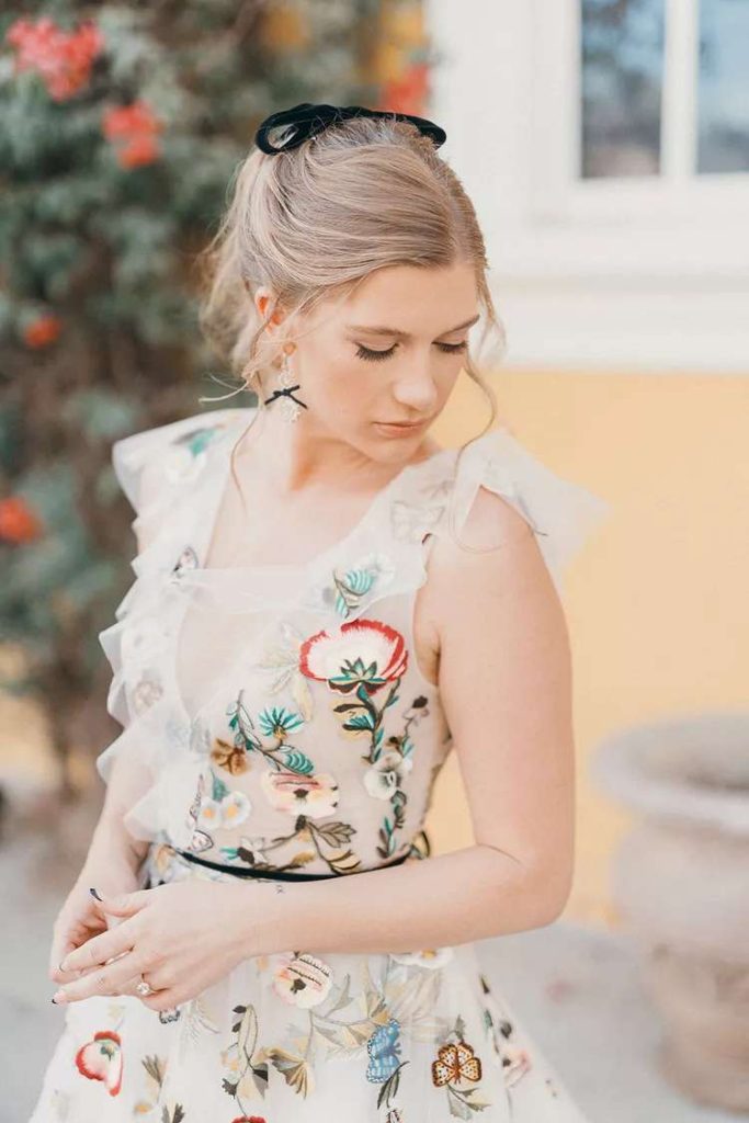 Floral jewels woven into the hair add a delicate and enchanting touch to any bride hairstyle. Whether incorporated into braids, buns, or flowing curls, these embellishments bring a whimsical, nature-inspired elegance to the bridal look.