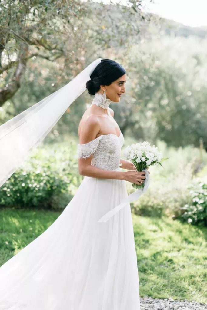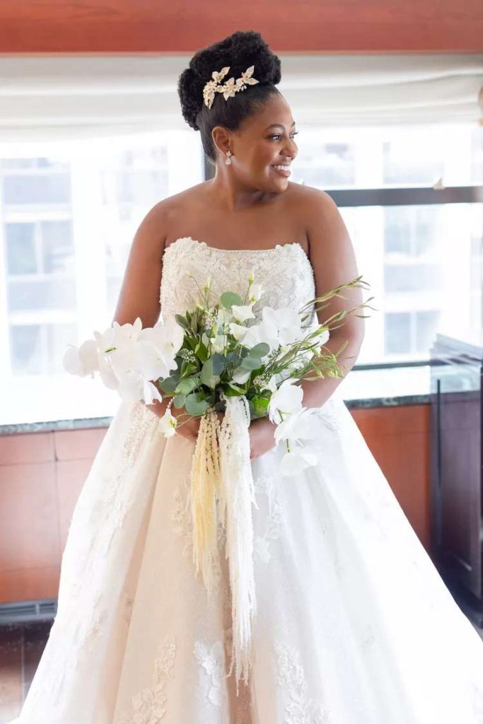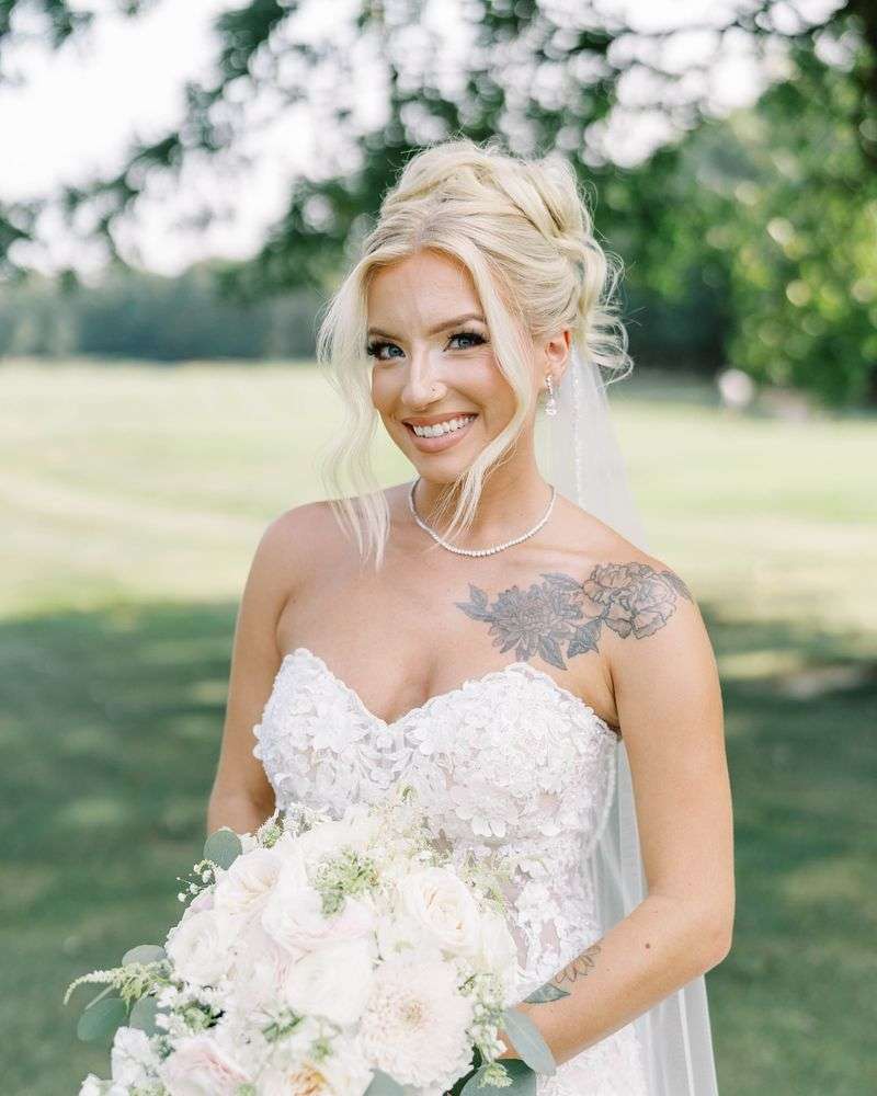 The twisted bun is a modern take on the classic bridal updo, featuring intricate twists that add texture and dimension. This bride hairstyles works well with both structured and flowy gowns, making it a versatile choice for any wedding theme. A few loose strands around the face add softness to the overall look.
