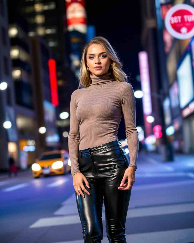 For a chic and cozy date night look, a turtleneck sweater paired with leather leggings is a stylish option. This outfit offers warmth without compromising on fashion, making it a great choice for fall or winter dates. Add ankle boots and a crossbody bag for a put-together look that’s both edgy and sophisticated.