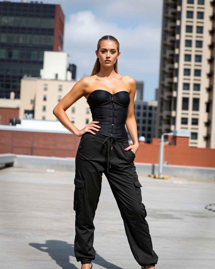 A corset top paired with cargo pants combines feminine elegance with street-style edge, making it one of the trendiest Date Night Outfit Ideas. The structured corset accentuates curves, while the relaxed cargo pants add a cool, laid-back feel. Finish the look with strappy heels or chunky sneakers for an effortlessly stylish outfit.