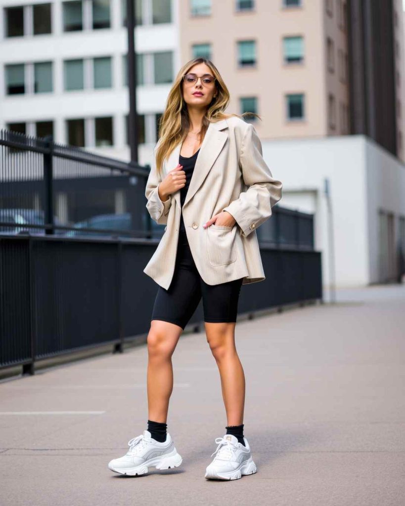 For a modern and fashion-forward look, pair an oversized blazer with bike shorts. This trendy combo is perfect for casual date nights, rooftop drinks, or a relaxed evening in the city. The structured blazer adds sophistication, while the fitted bike shorts keep it playful and chic. Finish with sneakers for a sporty touch or heels for extra glamour.