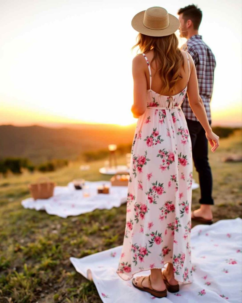 A floral maxi dress is perfect for a romantic and effortless date night look. The flowing fabric and delicate floral patterns add a touch of femininity, while sandals keep it casual yet chic. This is one of the best Date Night Outfit Ideas for outdoor dining, beachside walks, or summer picnics. Add dainty accessories for a dreamy and elegant finish.