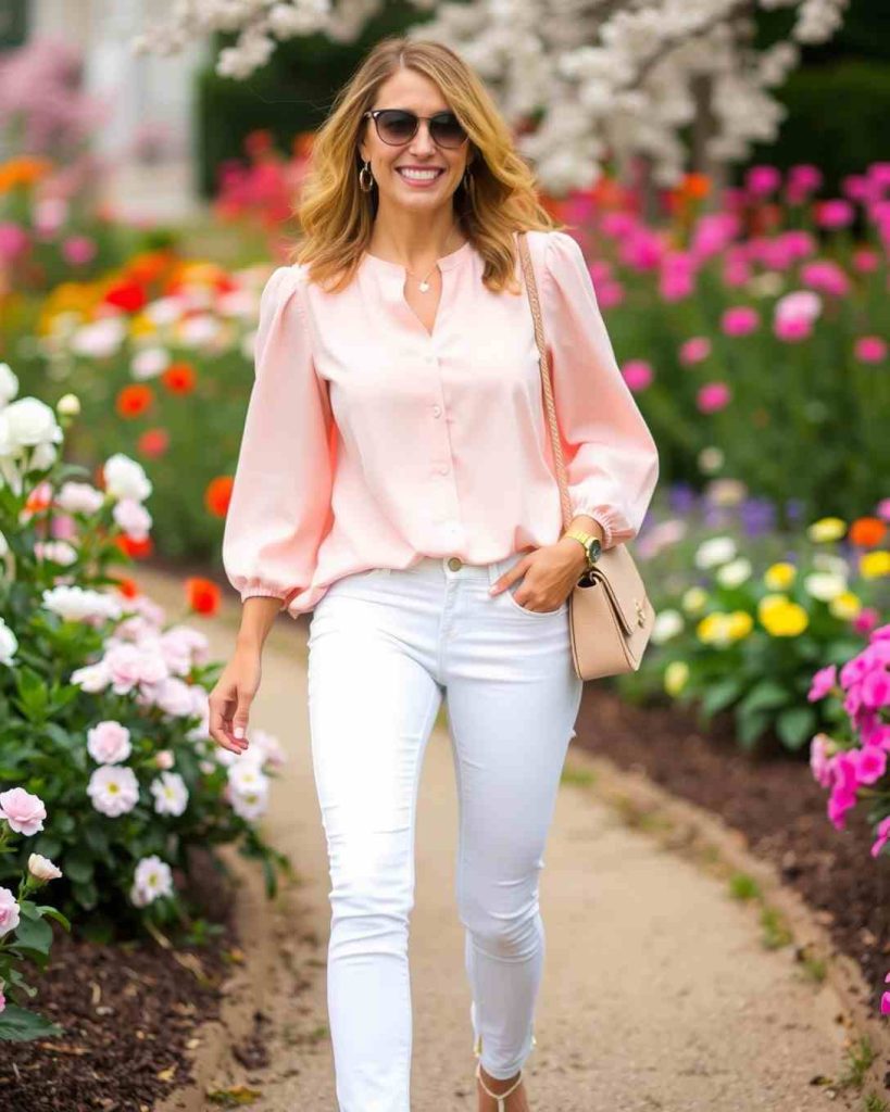 For a bright and feminine springtime look, a pastel blouse with white jeans is a perfect choice. The soft colors embrace the season, while the crisp white jeans keep the outfit fresh and polished. This is one of the most refreshing Date Night Outfit Ideas for a daytime date, outdoor brunch, or a casual evening in the city. Pair with nude heels or flats for a chic finish.