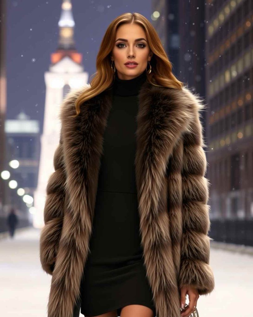 A faux fur coat layered over a turtleneck dress creates a glamorous winter date night look. The coat adds warmth and luxury, while the fitted dress keeps the silhouette sleek. This is one of the most elegant Date Night Outfit Ideas for a special occasion or holiday date. Complete the look with knee-high boots or classic pumps for a sophisticated touch.