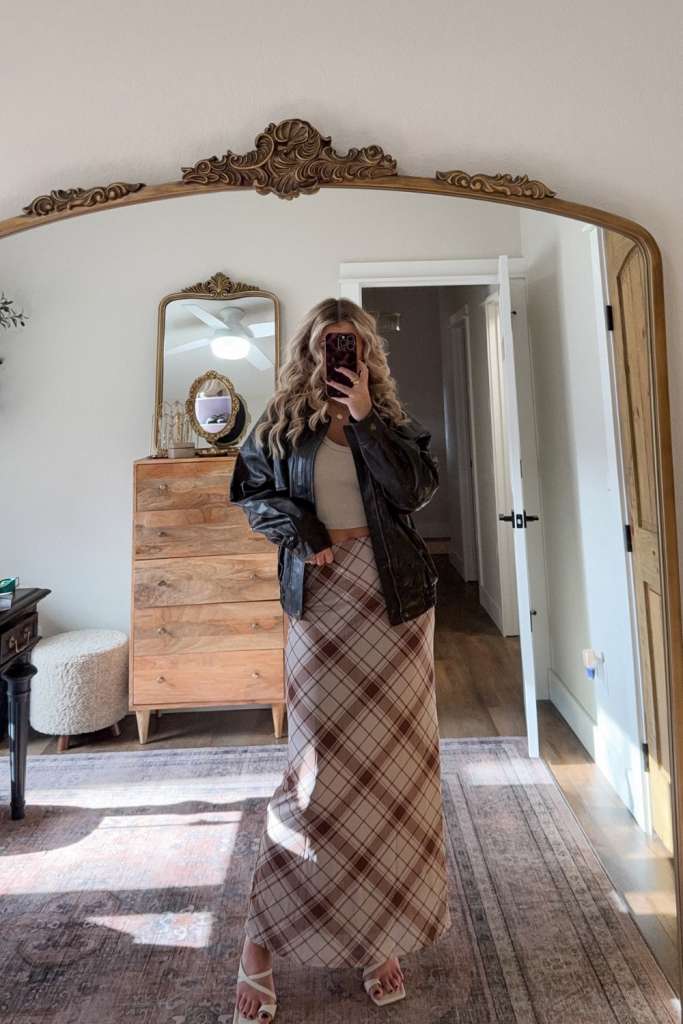 For an effortlessly cool and stylish Easter look, layer a leather jacket over a rib knit top and a plaid skirt. This mix of textures adds a trendy edge while keeping the outfit perfect for spring. Whether you’re dressing up for a casual gathering or a night out, this Easter Outfit Idea blends classic and modern fashion seamlessly.