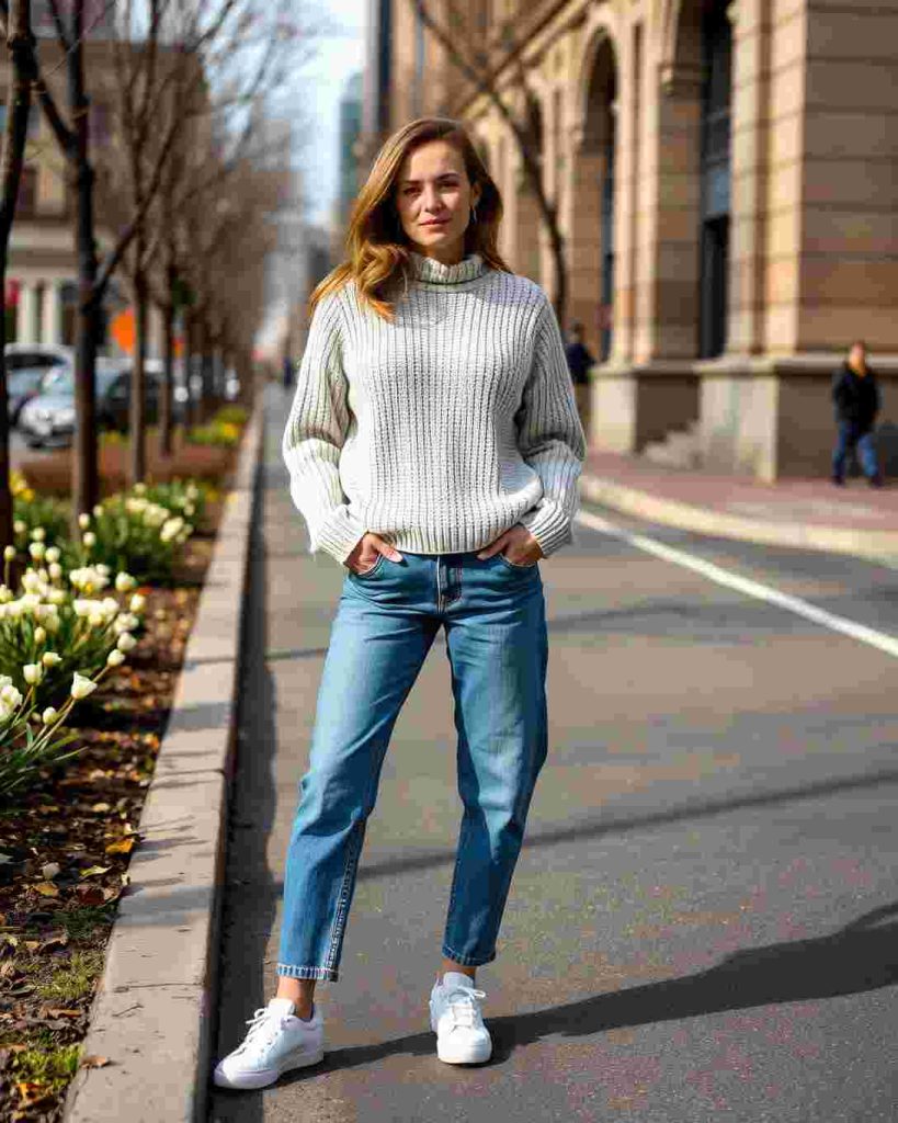A light knit sweater paired with jeans is a perfect choice for transitioning into spring. This casual yet chic outfit offers comfort while keeping you stylish for everyday wear. A neutral-toned sweater with classic denim creates a timeless March Outfit Idea.