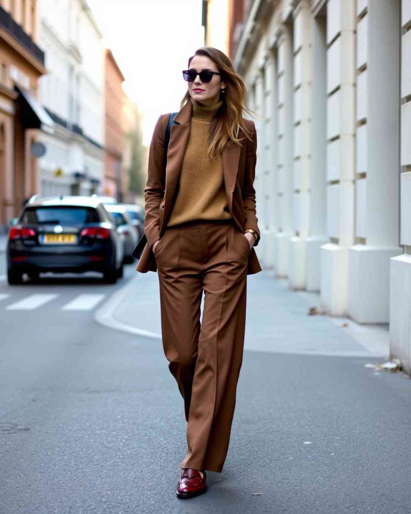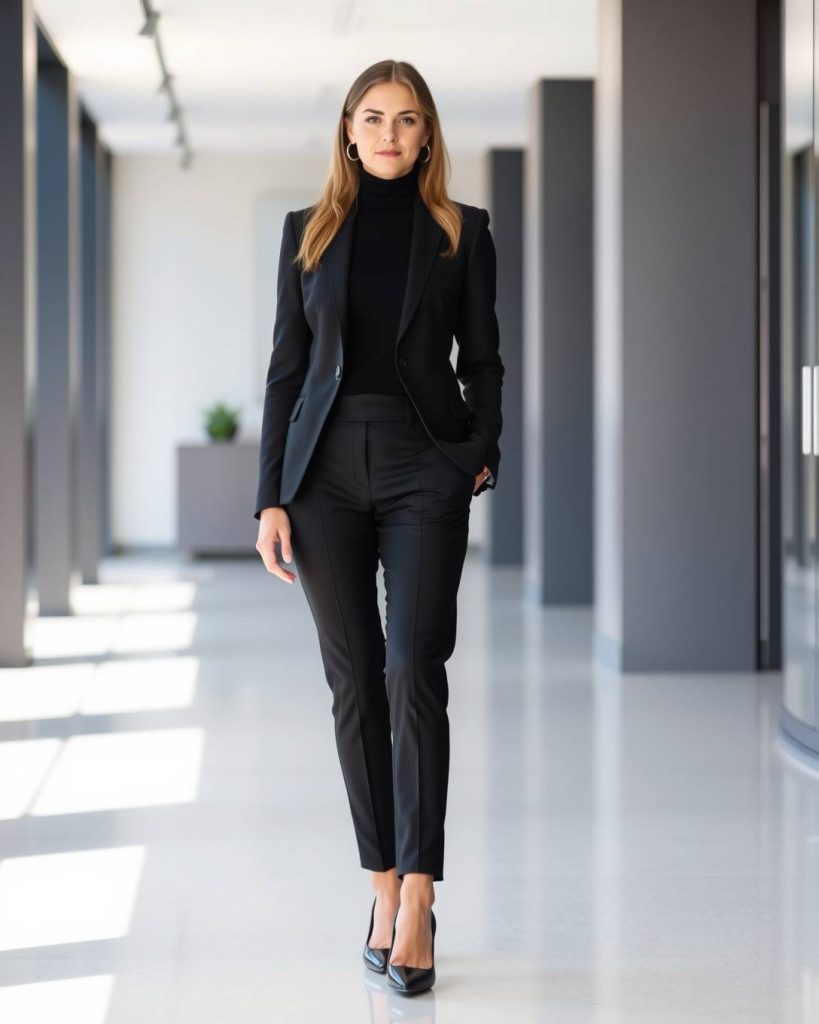 A monochrome suit paired with a turtleneck creates a sleek and modern look. Whether it’s for a business meeting or a stylish day out, this outfit is a power move in your March Outfit Ideas lineup.