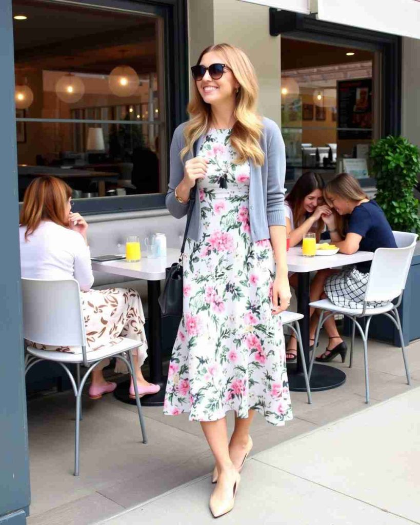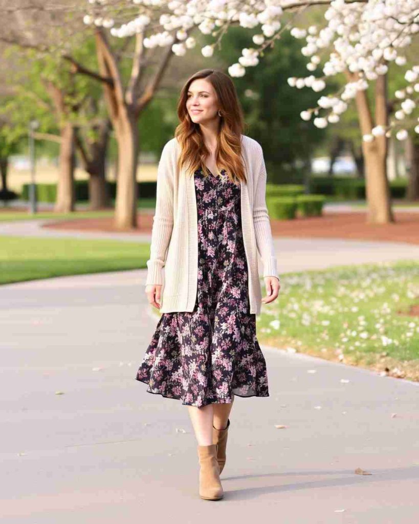 A floral midi dress paired with a cropped cardigan embodies early spring fashion. This outfit is ideal for casual strolls, brunches, or picnics, making it a fresh and feminine March Outfit Idea.