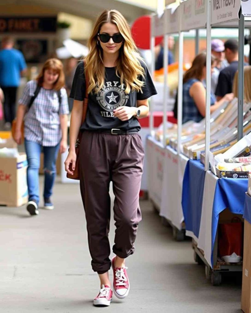 Paperbag waist pants paired with a graphic tee offer a trendy, relaxed style. This outfit is effortlessly stylish and comfortable, making it a must-have in your collection of March Outfit Ideas.