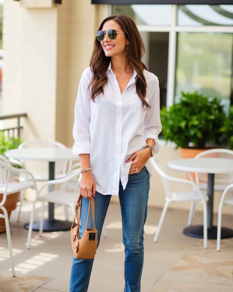 A crisp white button-down shirt with relaxed jeans is a timeless classic. This effortlessly chic outfit is perfect for work, casual outings, or weekend plans, making it a staple in March Outfit Ideas.
