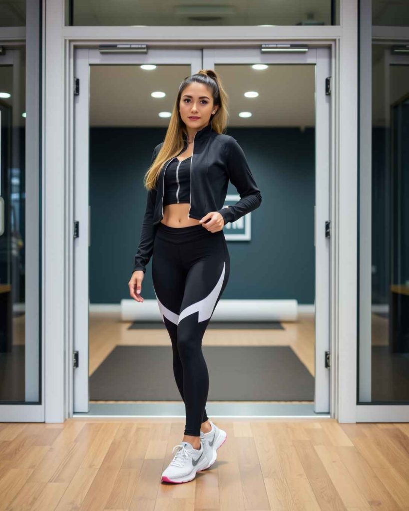 Leggings styled with a cropped zip-up jacket provide a sleek and sporty aesthetic. This outfit is great for workouts, casual outings, or layering for a stylish March Outfit Idea.