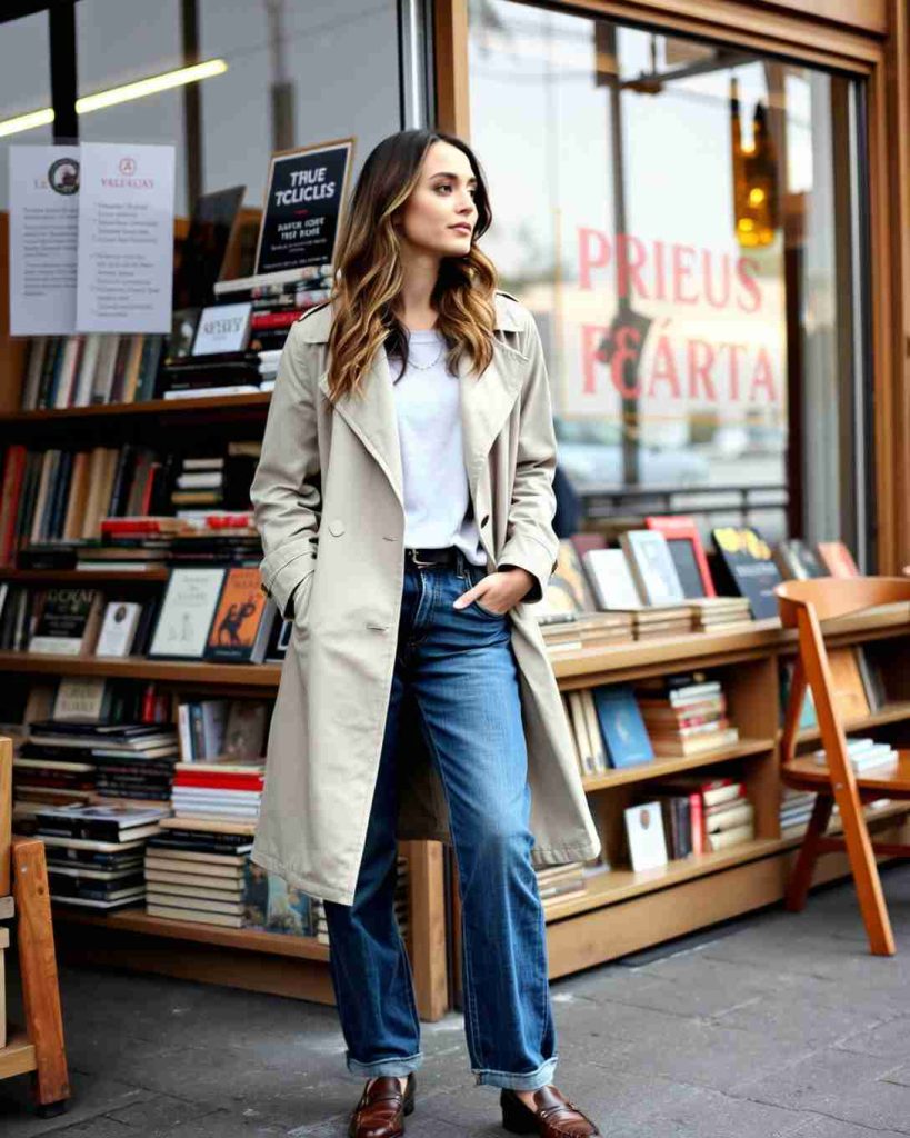 A classic trench coat over straight-leg jeans is a timeless look for early spring. This outfit balances elegance and casual charm, making it a must-have in March Outfit Ideas.