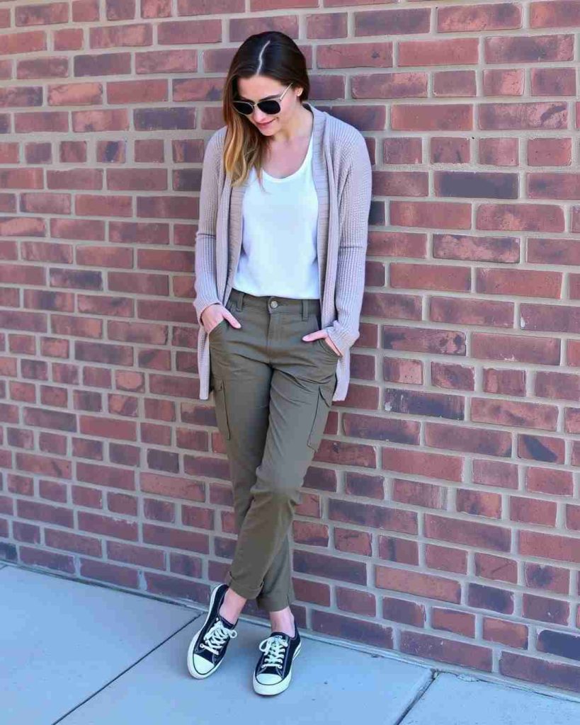 Cargo pants styled with a cropped cardigan blend comfort and fashion. This outfit is perfect for street-style lovers and those looking for trendy March Outfit Ideas.