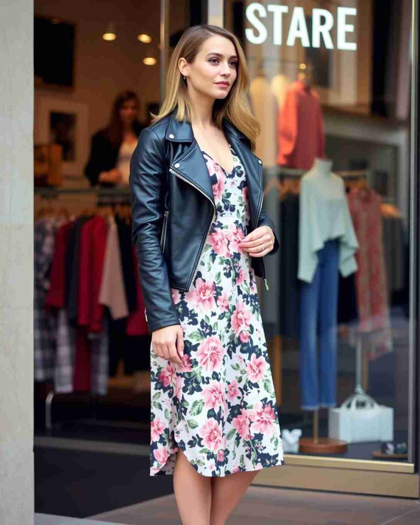A leather jacket over a floral dress creates the perfect mix of edgy and feminine. This look is great for transitioning seasons while keeping your outfit stylish and balanced.