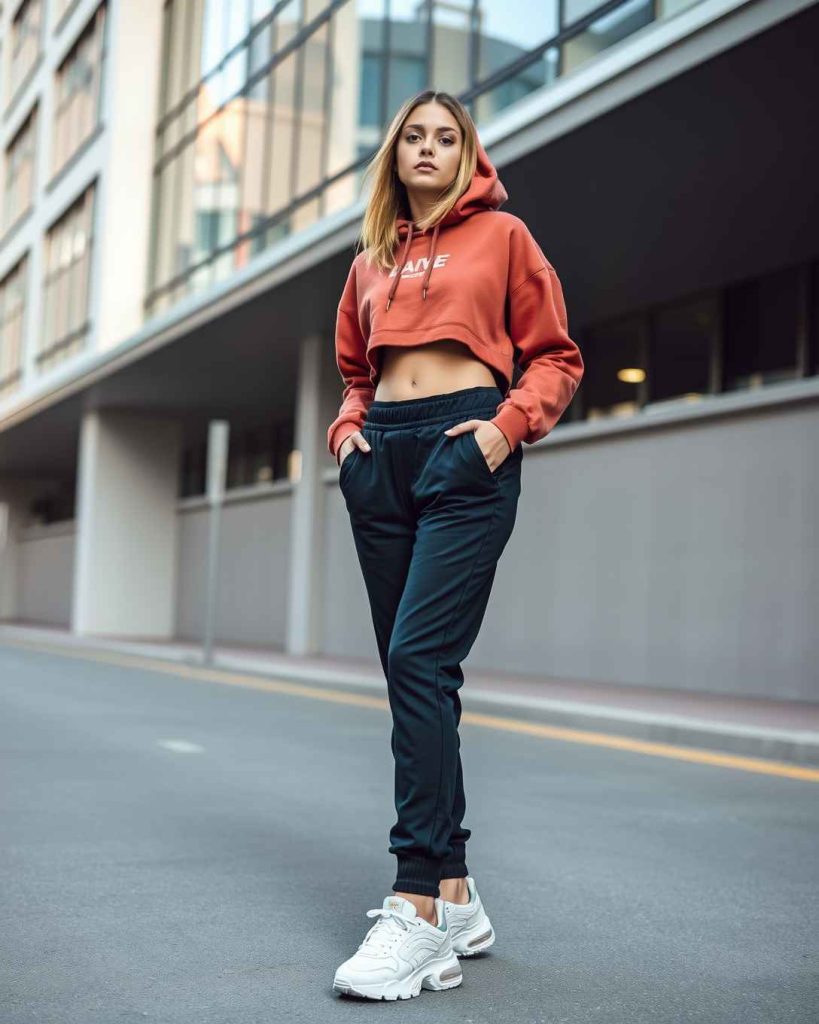 Stay comfortable yet trendy in a cropped hoodie with joggers, a perfect athleisure look for March. This relaxed outfit is great for weekend outings or lounging, making it an effortless yet stylish choice for the season.