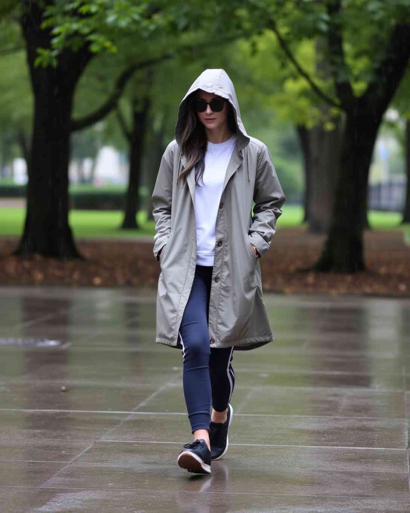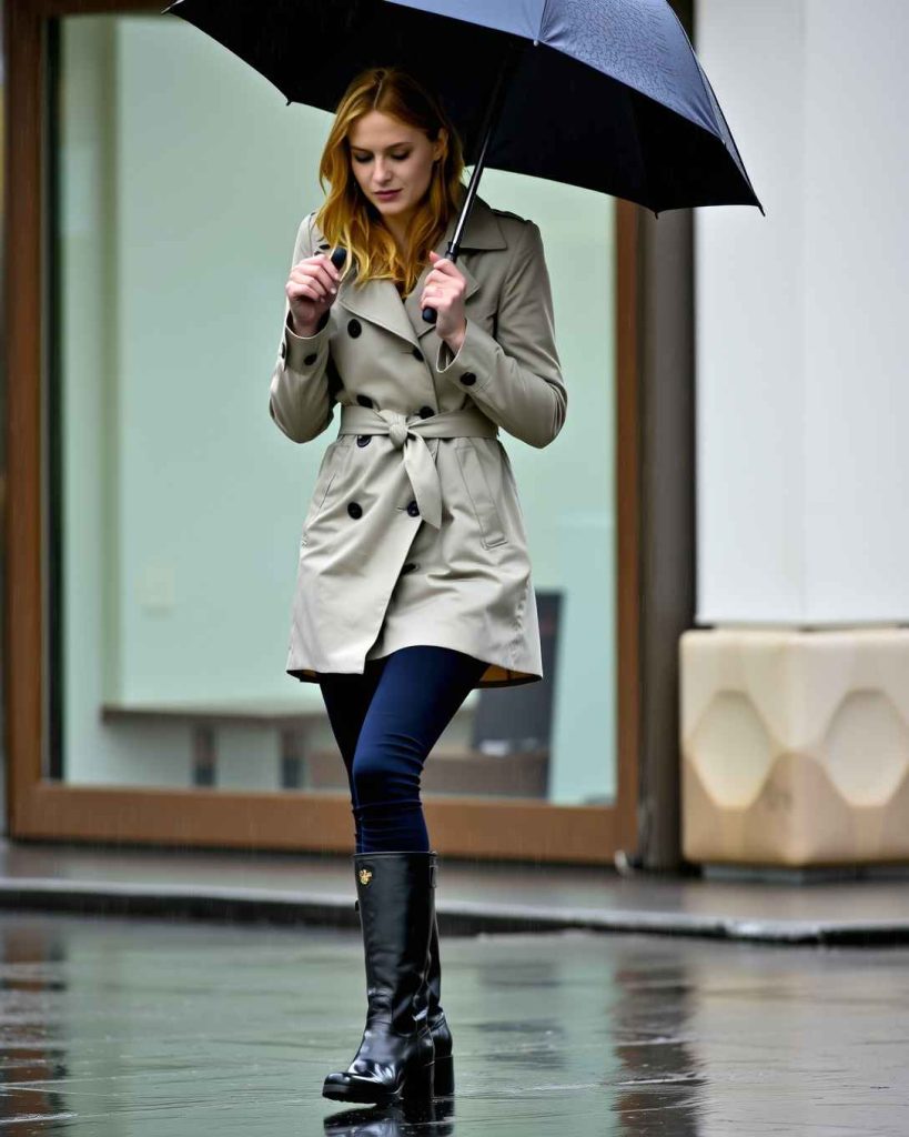 A waterproof trench coat paired with rain boots is a practical yet stylish choice for unpredictable March weather. This outfit keeps you dry while maintaining a chic and polished look, making it an essential March Outfit Idea for rainy days.