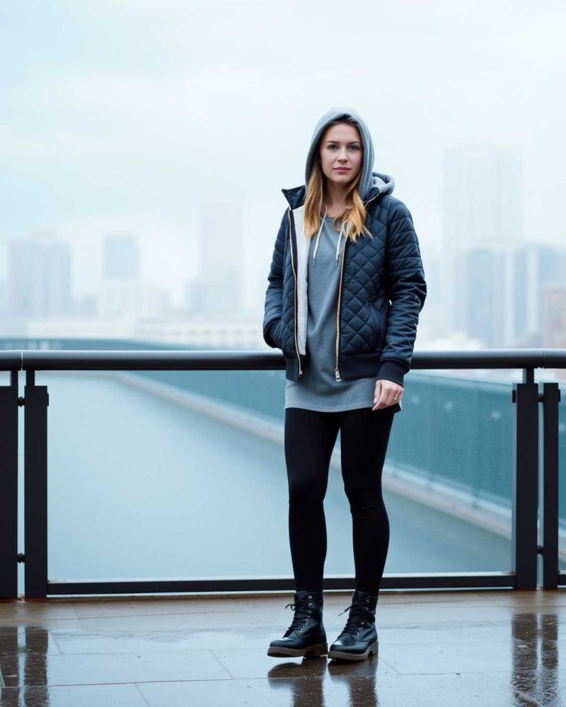 A quilted jacket layered over a hoodie with leggings creates a cozy yet fashionable ensemble for early spring. This outfit is ideal for casual outings, offering warmth without sacrificing style, making it a must-have in March Outfit Ideas.