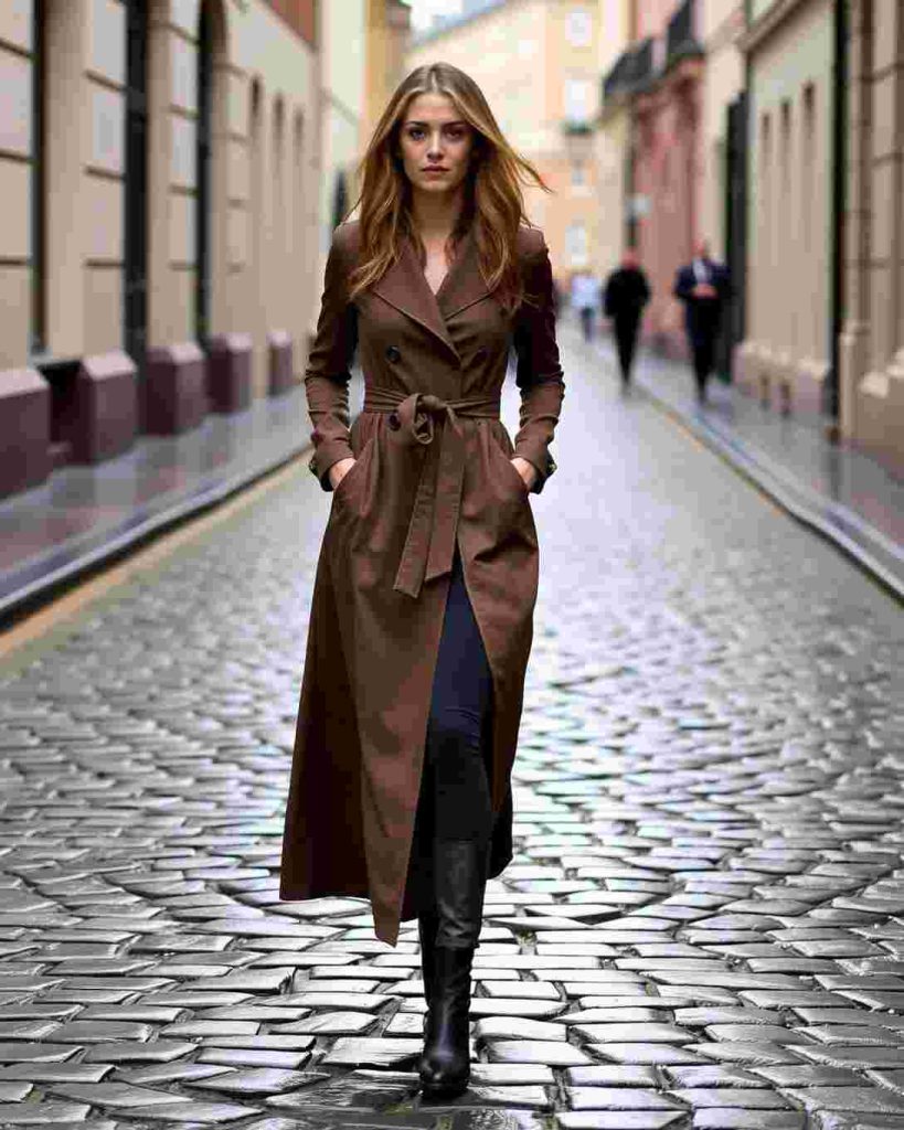 A long-sleeve maxi dress paired with a belted raincoat provides an elegant and weather-ready outfit for March. The flowing silhouette contrasts beautifully with the structured coat, creating a sophisticated March Outfit Idea.