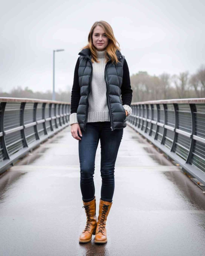 A puffer vest layered over a sweater with jeans is the perfect in-between-season look. This stylish and functional outfit keeps you warm on cooler days while still feeling light and breathable for early spring.