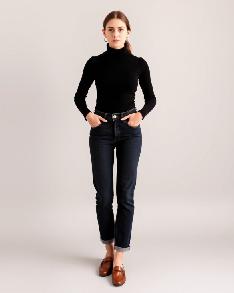 A fitted turtleneck tucked into high-waisted mom jeans creates a polished yet laid-back look. Whether you’re heading to work or a casual meet-up, this outfit is a stylish choice for early spring fashion.
