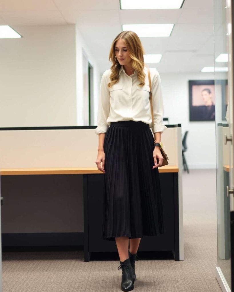 A pleated midi skirt paired with a button-up blouse offers a classy yet effortless look. This outfit is perfect for office wear or a business-casual lunch, making it a staple in any March Outfit Ideas collection.