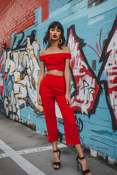 A bold red off-shoulder two-piece set is both playful and elegant. The off-shoulder design adds a touch of romance, while the coordinated set keeps it stylish. Ideal for those looking for standout night out outfit ideas that are effortlessly chic and eye-catching.