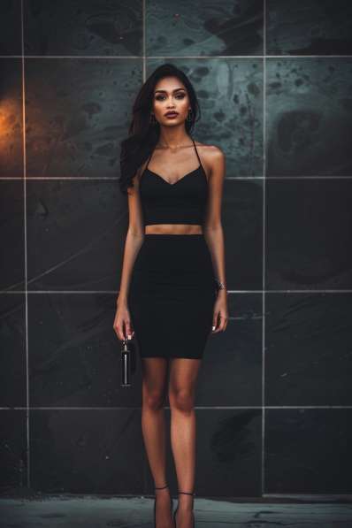 A classic black crop top and skirt set is a timeless option that works for any occasion. This sleek and coordinated look is easy to style with bold accessories or a chic clutch. Perfect for those who love night out outfit ideas that balance elegance and fun.