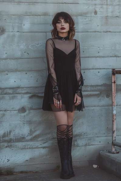 6. Gothic-Inspired Sheer Black Dress and Combat Boots