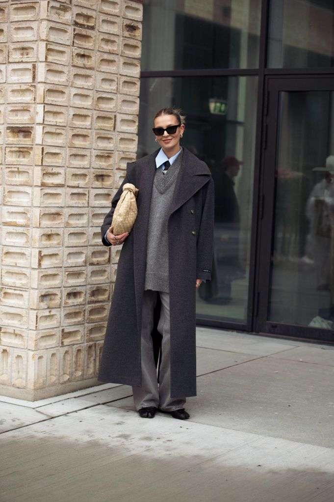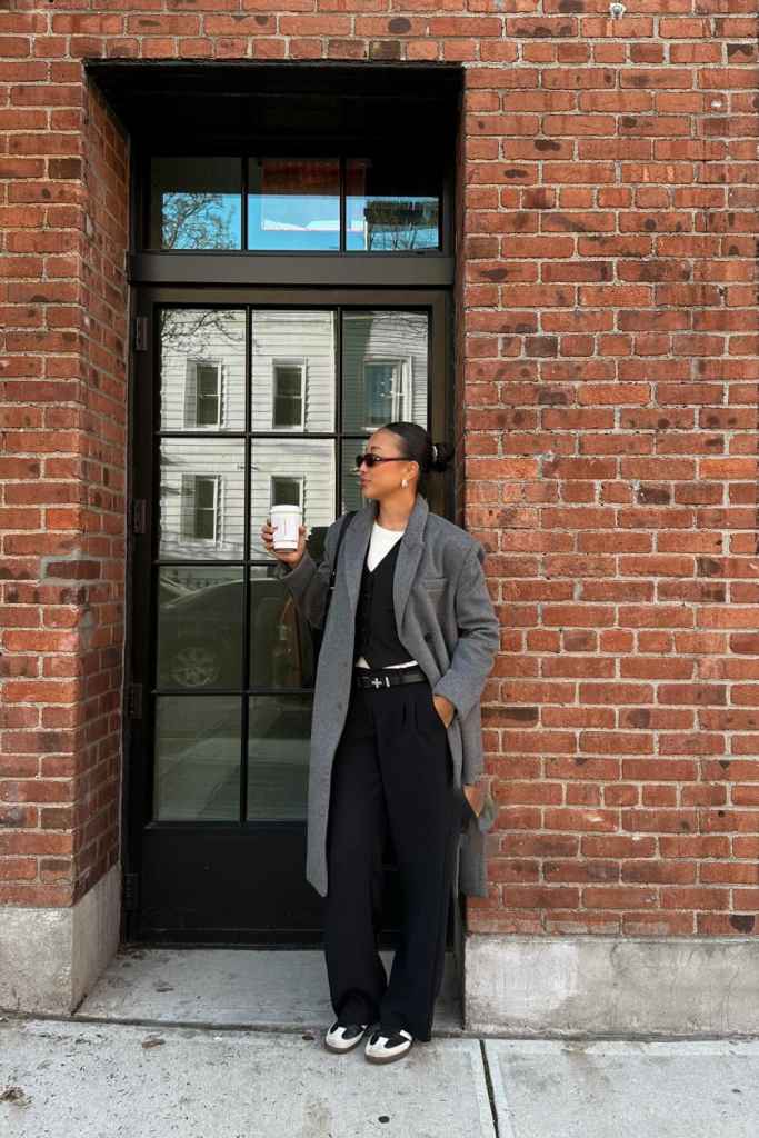 A gray trench coat over a black vest and white shirt with black pants creates a sophisticated and structured office outfit idea. This neutral color palette exudes elegance, while the layering adds depth and dimension to the overall look.