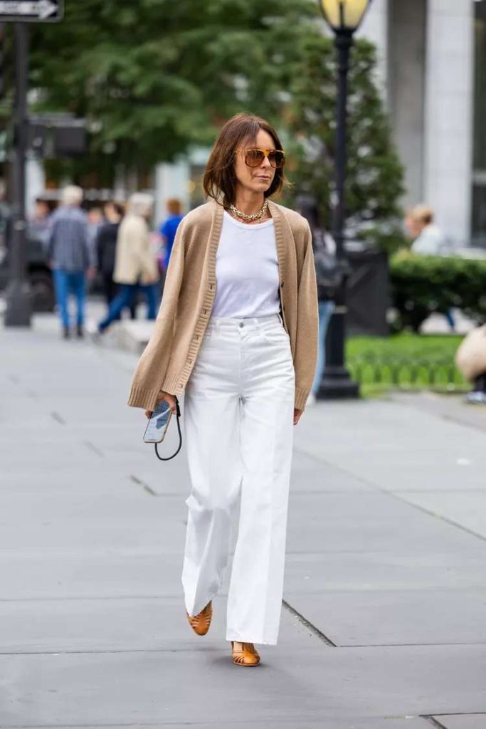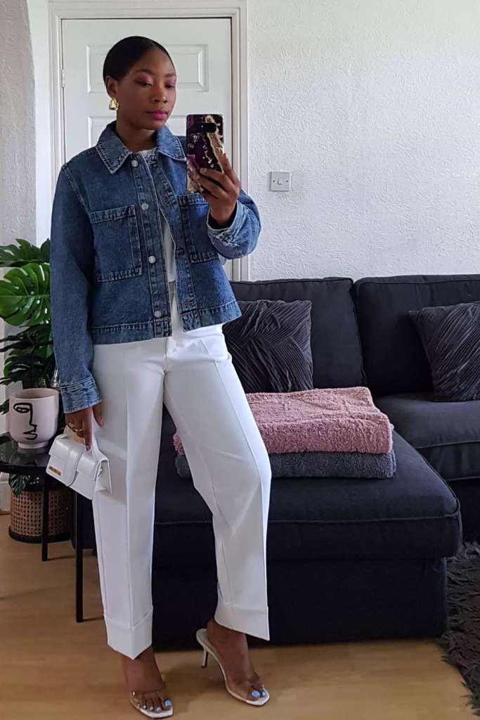 A denim jacket layered over a crisp white shirt and white trousers creates a smart-casual take on office outfit ideas. The contrast of structured tailoring with relaxed denim adds versatility, making this an ideal choice for casual Fridays or creative workplaces.