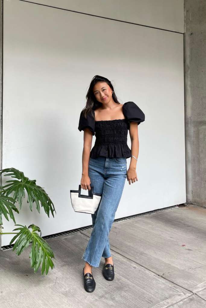 A black peplum top paired with denim and loafers makes for chic office outfit ideas that blend femininity with structure. The peplum silhouette adds a flattering touch, while loafers keep the look polished yet comfortable for all-day wear.