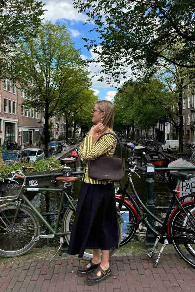 Brighten up your office outfit ideas with a yellow striped blouse tucked into a black skirt, finished with classic Mary Janes. This look balances playful charm with sophistication, making it a great choice for adding a pop of color while maintaining a professional feel.