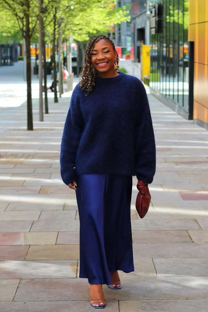 Soft meets sleek with a blue sweater and satin skirt, an effortlessly stylish addition to office outfit ideas. The mix of textures brings a modern edge, while clear heels subtly elevate the look, making it perfect for a chic yet professional ensemble.
