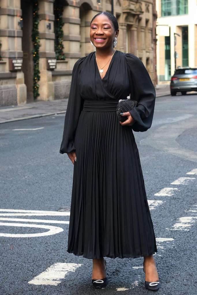 A black dress remains a timeless staple in office outfit ideas, effortlessly chic and endlessly versatile. Pair it with heels featuring a silver buckle for a refined touch, ensuring a polished look that works for meetings, presentations, or after-work gatherings.