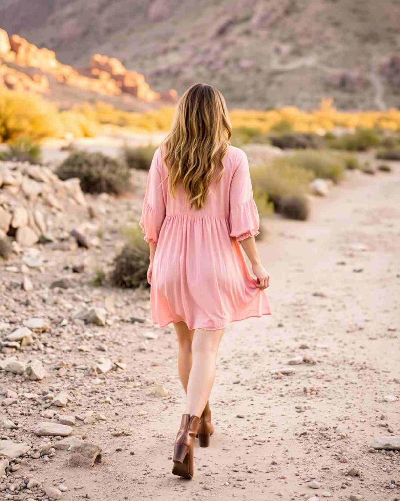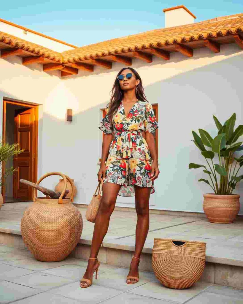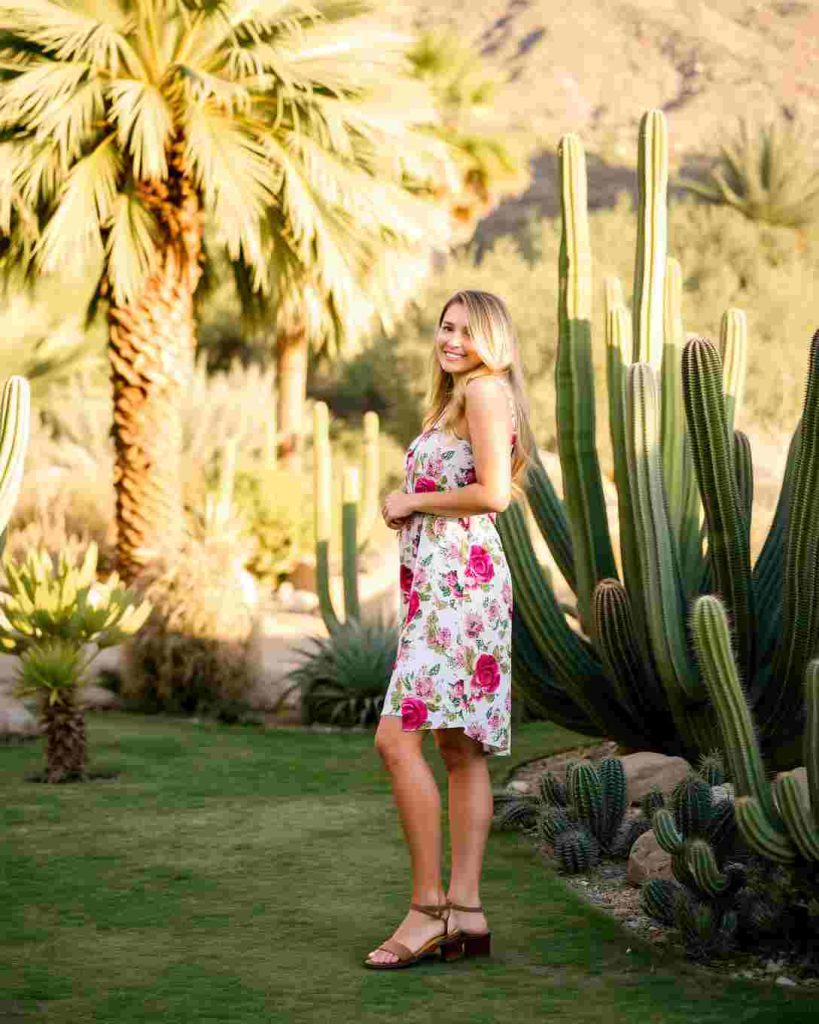 Palm Springs outfits often feature breezy floral sundresses paired with chic sandals, perfect for exploring the city’s sunny streets and desert gardens.