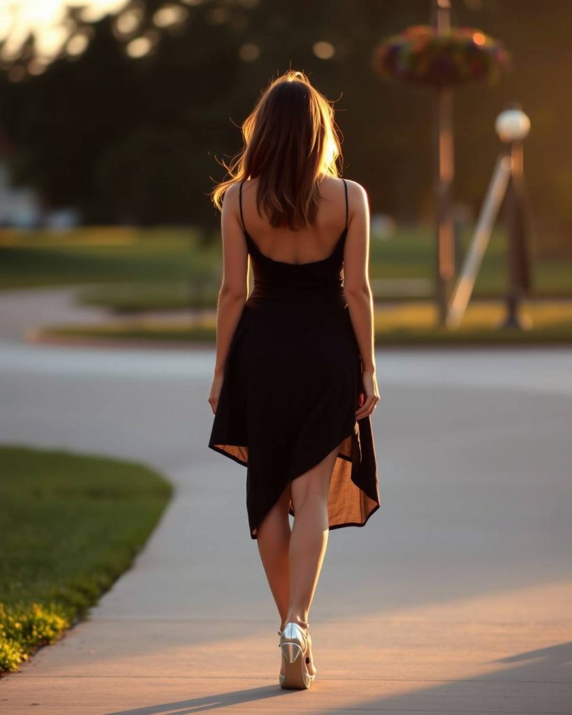 14. Asymmetric Hem Dress with Metallic Sandals