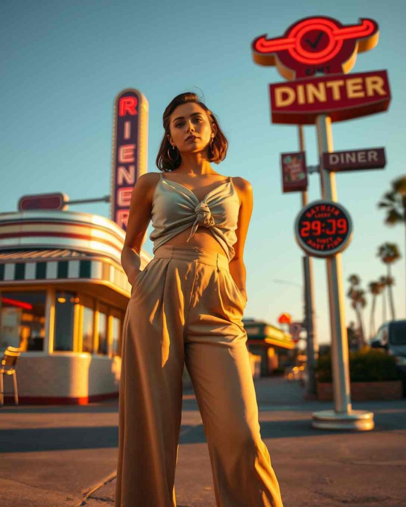 Crop tops and high-waisted culottes create modern Palm Springs outfit, perfect for exploring outdoor markets or casual dining.