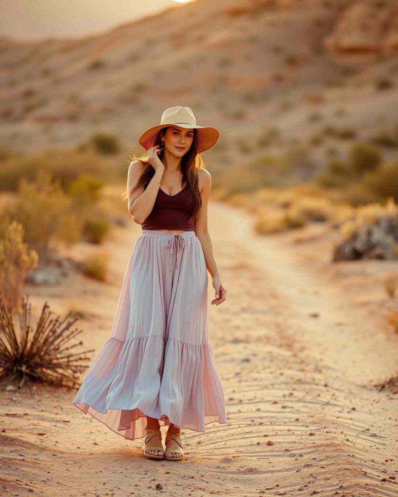 A wide-brim hat paired with a flowy maxi skirt defines relaxed Palm Springs outfits, combining style and sun protection effortlessly.