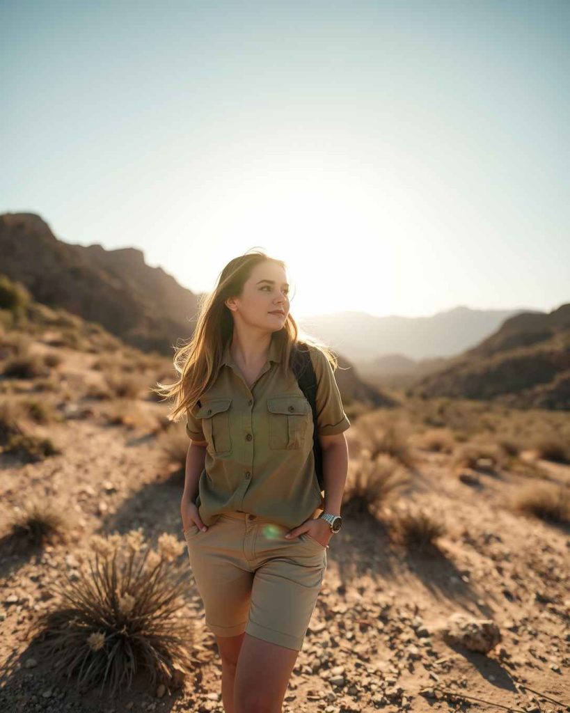 Khaki shorts and utility-style shirts are practical Palm Springs outfit, ideal for scenic hikes or casual desert walks.
