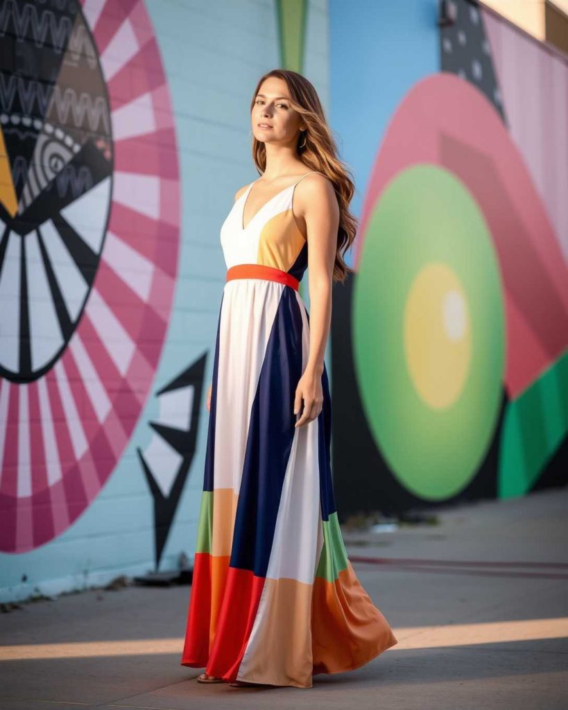 Color-blocked maxi dresses are vibrant Palm Springs outfits, standing out in artistic settings with bold, geometric designs.