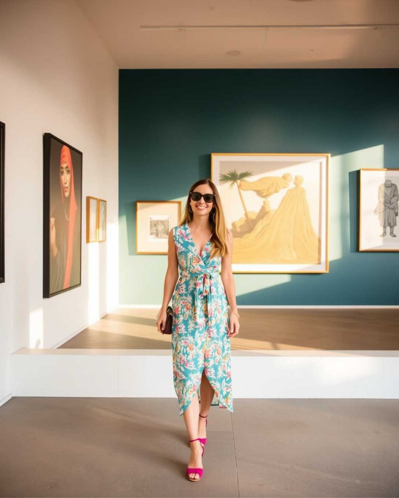 Bright wrap dresses bring a lively touch to Palm Springs outfit, perfect for gallery walks or sunny afternoons in the city.