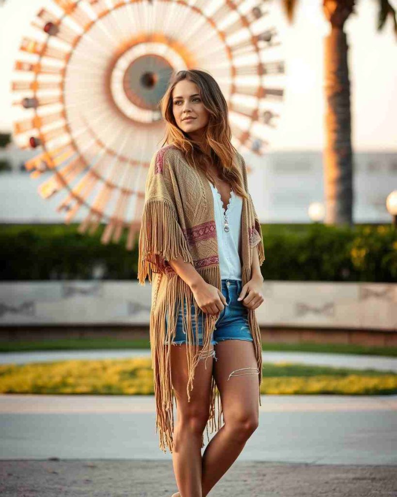 Fringed kimonos paired with distressed denim shorts are relaxed Palm Springs outfits, perfect for boho-inspired outdoor events.