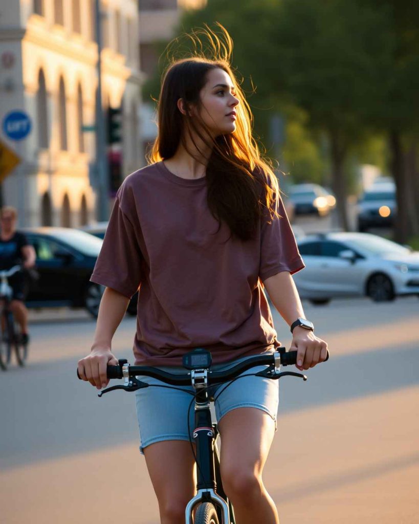 Bike shorts and oversized tees are casual yet trendy Palm Springs outfit, great for morning rides through the scenic city.