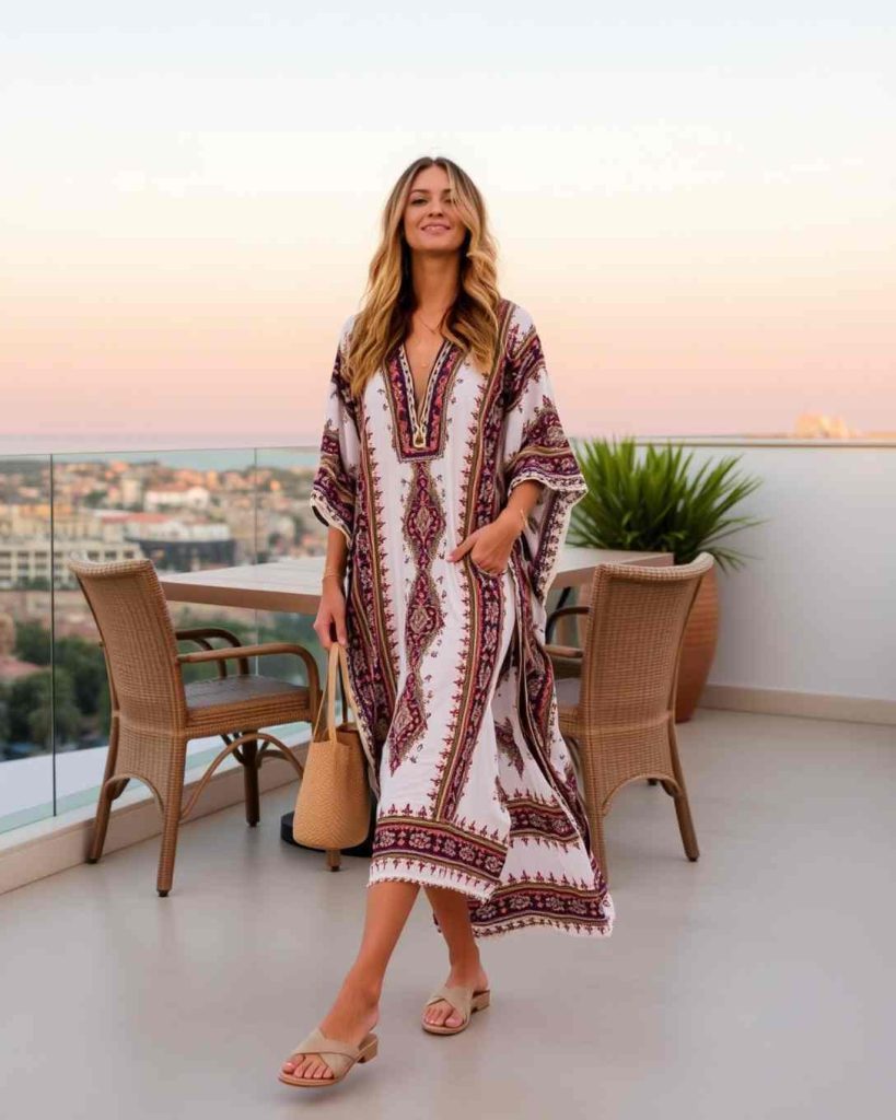 Breezy kaftans styled with minimalist sandals are classic Palm Springs outfits, perfect for enjoying sunset dinners on a terrace.