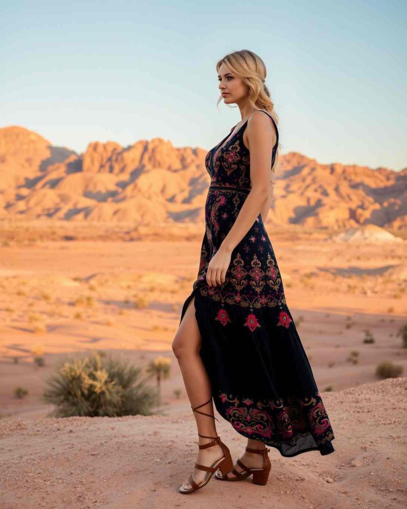 Embroidered dresses paired with gladiator sandals are elegant Palm Springs outfit, ideal for taking in the stunning desert vistas.