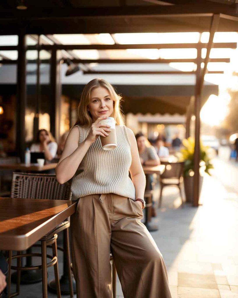 Wide-leg trousers and sleeveless knit tops are ideal Palm Springs outfits for casual afternoons, combining modern chic with desert-inspired ease.