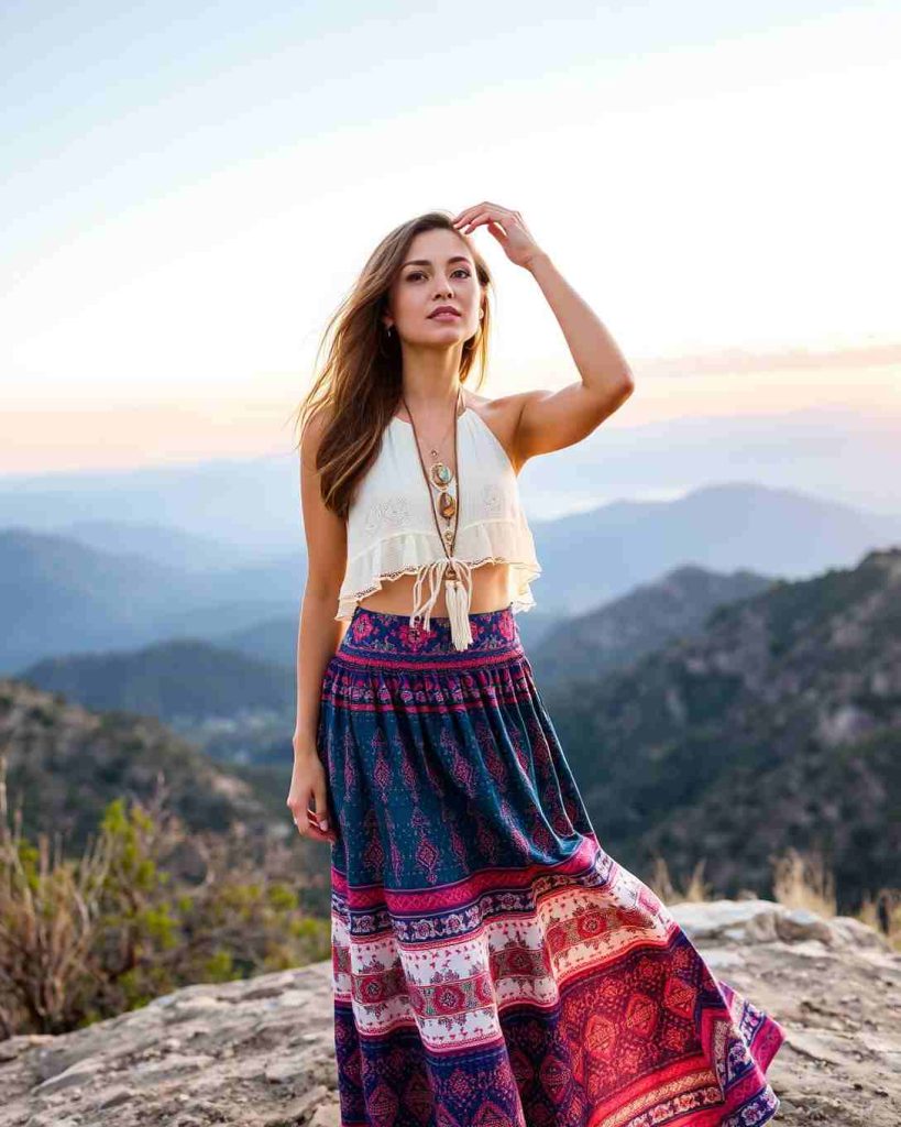 A bohemian midi skirt and halter top make standout Palm Springs outfits, combining free-spirited style with the area’s iconic desert aesthetic.